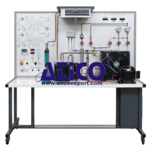 This training unit allows students to investigate air conditioning at a basic level. Students can use Pressure Enthalpy and Psychrometric charts for their calculations and discover the enthalpy change. The unit features an air-cooled condenser unit connected to an evaporator located in an air duct. The air duct contains relative humidity and temperature sensors on both sides of the evaporator. A small fan provides air flow down the duct and air flow rate can be manually adjusted. The refrigeration circuit features high and low pressure gauges, a pressure switch, sight glass, filter dryer and TEV valve. The circuit also includes pressure transducers that connect to the instrumentation. Four thermocouples placed around the refrigeration circuit allow observation of temperatures, these can be used for the calculation of potential super heating and sub-cooling.