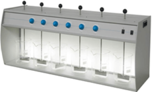 This equipment has been designed to optimize the dosage of coalescent in sewage disposal, that is to carry out the well known “jar test”. Multiple stirrers with reproducible stirring speeds allow to adopt standard conditions for the tests, that are the basic requirement for reproducible results. A special switch available on the front panel enables to backlight the sample being examined for easier readings. The rotation speed can be programmed from 10 to 300 r.p.m.
